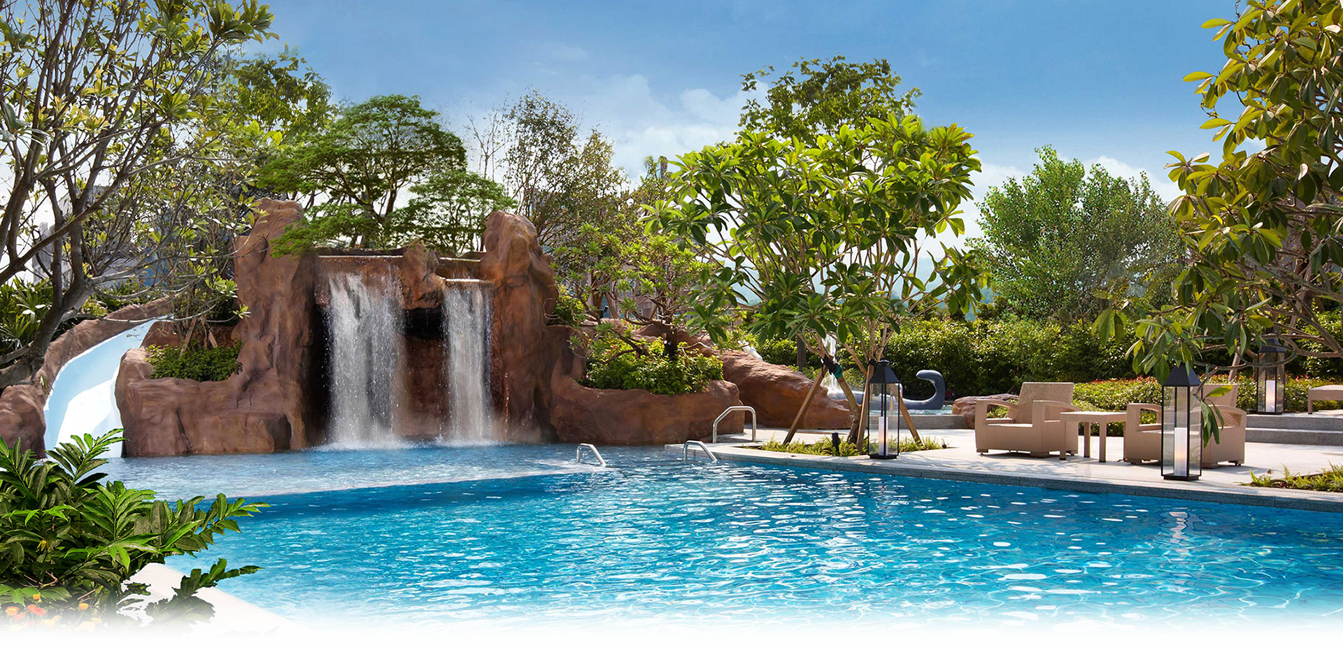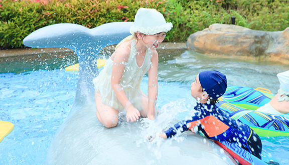 水深45公分的小朋友泳池設有迷你滑水道,搭配裝置造型的鯨魚一躍而出,彷彿置身海底世界一起悠遊,增添歡樂童趣。