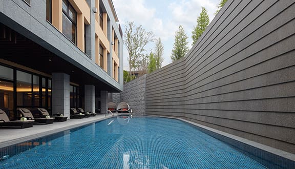 寬敞的室外泳池是您煥發活力的休憩空間,在自然陽光的照射下充滿活力及樂趣。盡情暢快的游泳後,在池畔的軟墊日光浴床休息,前方的水瀑令人自在而放鬆,您可在游泳後餟飲一杯消暑飲品或運動飲料、閱覽好書,享受輕快而舒爽的寧靜。