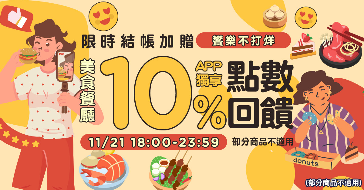 - 限APP購買,活動時間 ( 2025 / 11 / 21 (五) 18:00 ~ 23:59 ) 完成下單方具贈點資格;若未完成交易或後續退貨,則視同放棄贈點權益。美食餐廳 ( 不含咖啡/速食館 ) 頻道商品核銷後即贈點。