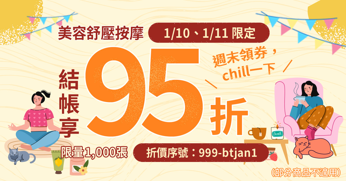 - 結帳時勾選「使用折價券」並輸入【 999-btjan1 】折價序號,即可折抵序號券上指定折數,僅部分商品適用。