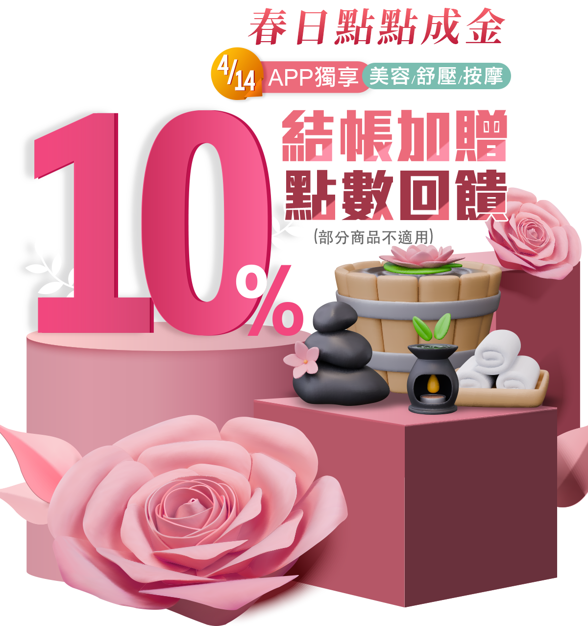 - 需於APP購買,活動時間(2026 / 4 / 14 (二) 09:00 ~ 23:59)完成下單方具贈點資格;若未完成交易或後續退貨,則視同放棄贈點權益。美容舒壓、按摩頻道商品核銷後即贈點。