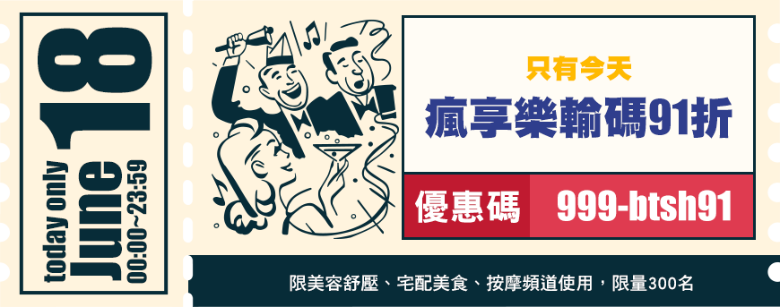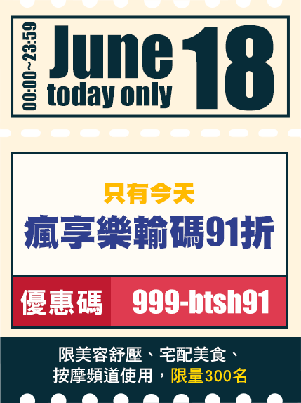 - 瘋享樂輸碼 91折僅限美容舒壓、宅配美食、按摩頻道使用。
