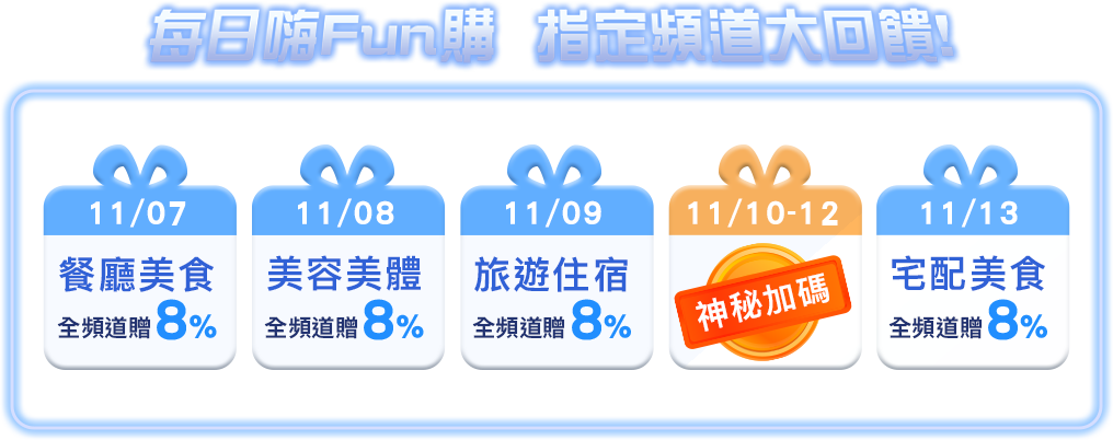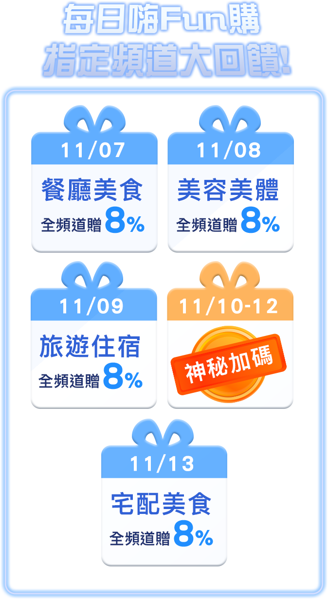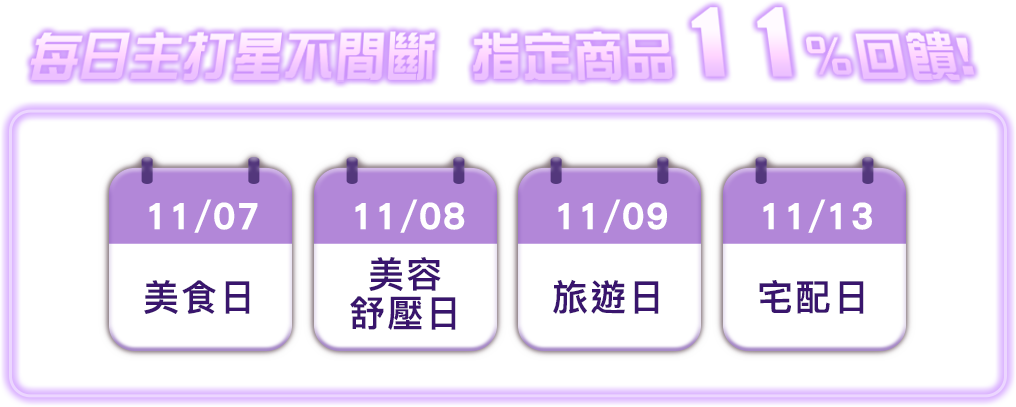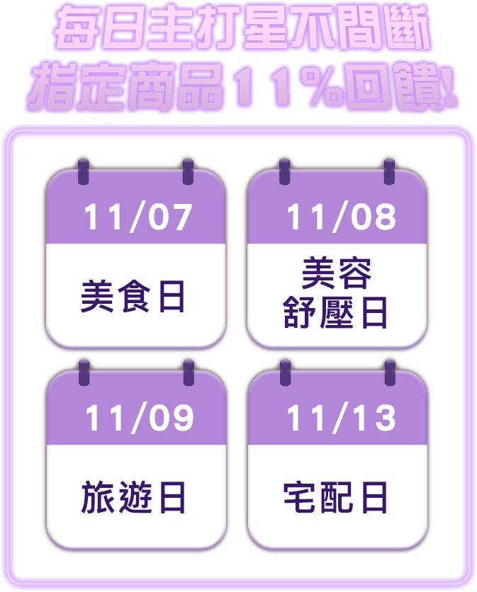 •於活動時間(2022/11/07 09:00~2022/11/10 08:59、2022/11/13 09:00~2022/11/13 23:59)內使用GOMAJI平台購買【11.11麻吉嗨Fun購】指定商品即可獲得11%點數回饋資格,商品核銷後即贈點。