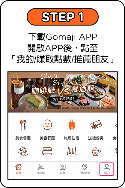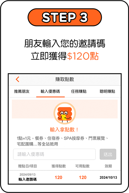 - 請透過 Gomaji APP功能列/我的/賺取點數/輸入優惠碼,輸入 Gomaji官方邀請碼即可獲得 100點數,或輸入朋友個人邀請碼則可獲得 120點 (每位用戶僅可擇一參加一次)。