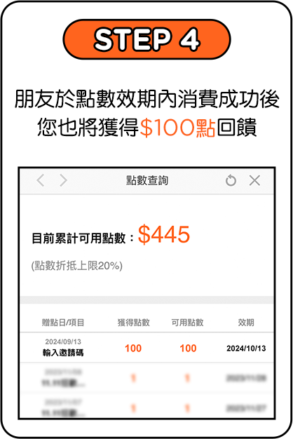 - 專屬邀請碼可無上限分享給您的親友們,唯每支手機門號限領取點數一次。