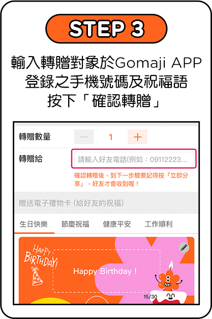 - 贈禮人及轉贈對象 APP版本須請更新至最新版,轉贈對象如非 Gomaji會員,請好友下載 App進行手機認證。