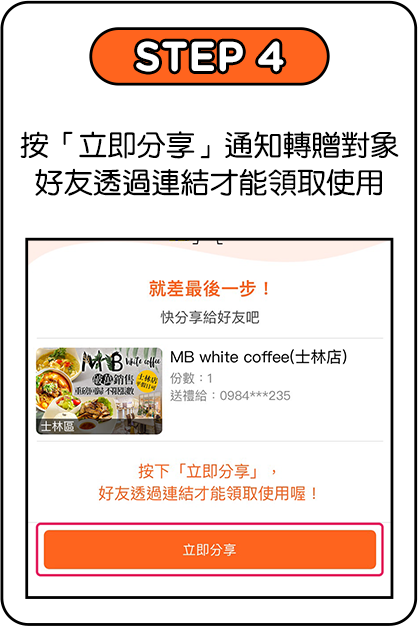 - 優惠票券效期小於 4日之訂單無法轉贈。