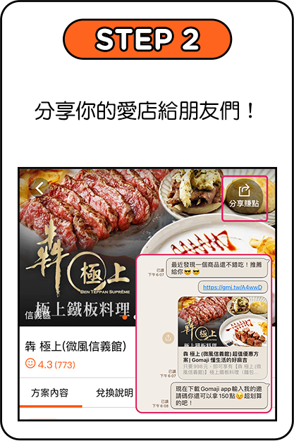 - 請透過最新版 Gomaji APP分享商品連結,當朋友經由您的專屬連結購買指定商品,序號一經核銷,將立即回饋您訂單結帳金額 2%的點數。