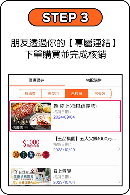 3. 分享最麻吉:分享商品連結給朋友,朋友經由您的專屬連結購買指定商品,並於活動期間內完成核銷即符合。