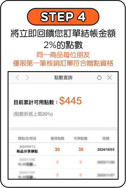 - 專屬連結可無上限推薦給您的親友們,唯同一商品每位朋友僅限第一筆核銷的訂單方符合贈點資格。