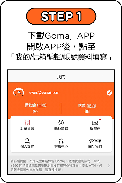 - 請透過 Gomaji APP 功能列/我的/信箱編輯/帳號資料填寫,完成資料填寫即可獲得 30點。(每位用戶僅可填寫一次)