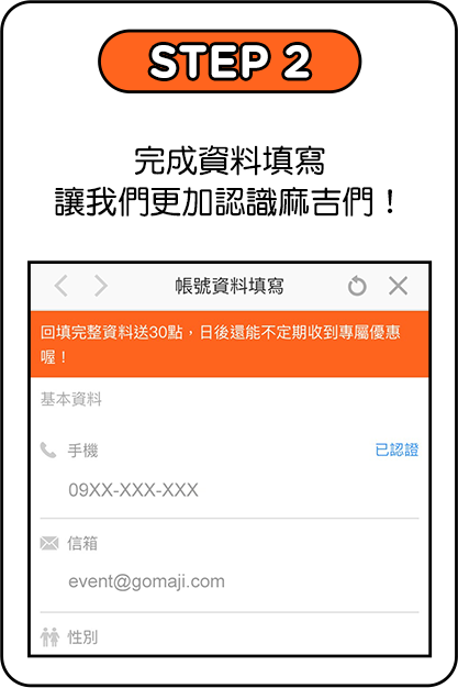 4. 自我介紹吧!:完成帳號資料填寫,並得到 30點即符合。 - 限定 Gomaji App用戶參加,需完成驗證手機號碼。