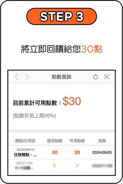 - 點數將於 10分鐘內匯入帳戶,同步會收到APP推播通知。點數效期為匯入後 30天。
