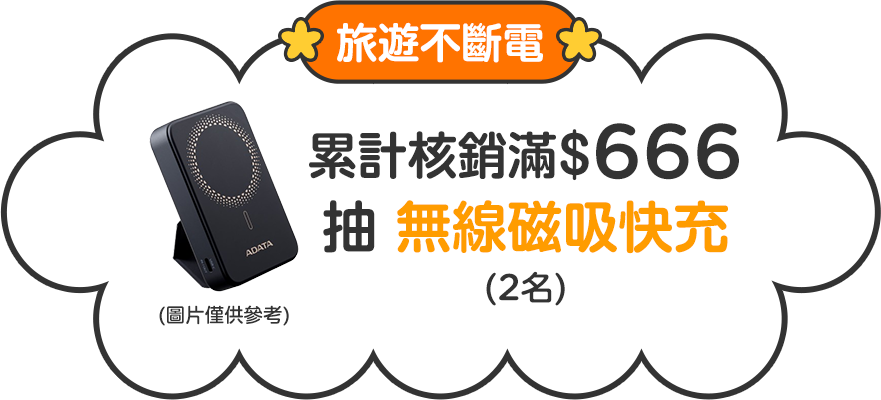 - 滿額 $666抽 無線磁吸快充(支援 Magsafe/具Wh標示),市值 $2,399、共抽 2名。