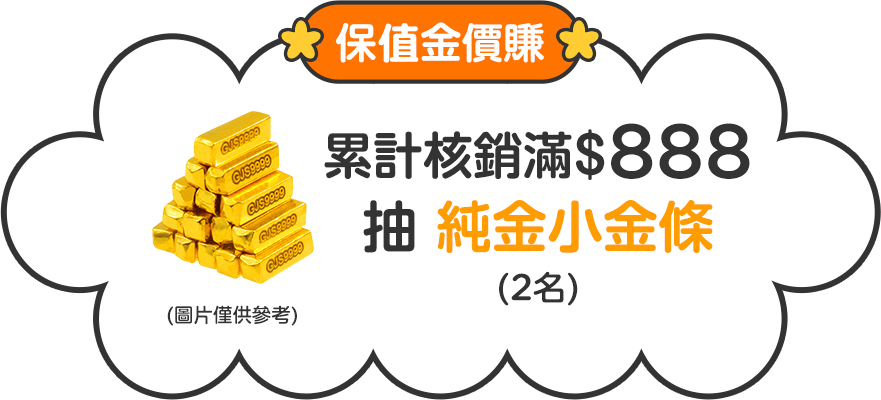 - 滿額 $888抽 9999保值小金條(金重0.13錢),市值 $5,000、共抽 2名。