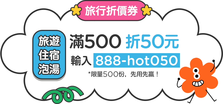 - 旅遊住宿.泡湯:輸入【888-hot050】滿 $500現折 50元。