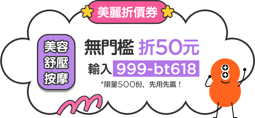 - 美容舒壓.按摩:輸入【999-bt618】無門檻現折 50元。