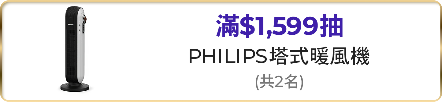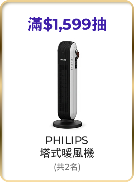 - 滿 NT$ 1,599抽飛利浦塔式暖風機(價值約$3,290),共 2名。