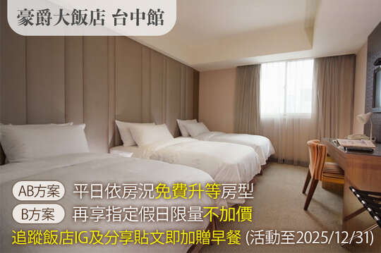 雙人/三人/四人住宿,AB方案平日依房況免費升等房型,A方案再享週六限量優惠加價100元,B方案再享指定假日限量不加...