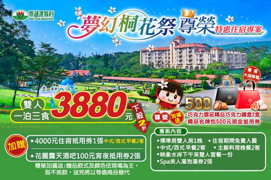 夢幻桐花祭x螢火紛飛,雙人一泊三食,贈送:4000元住宿抵用券